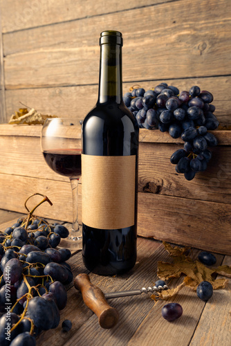 © Igor Normann, Fototapeta premium Bottle of red wine and blue grapes on a old wooden table.