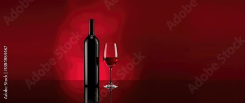 © vxnaghiyev, Obraz premium Bottle of red wine on a red backdrop, leaving room for your text