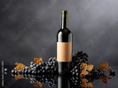 © Igor Normann, Naklejka premium Bottle of red wine with blue grapes on a black reflective background.