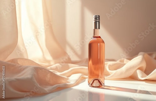 © Maryna, Fototapeta premium Bottle of rose wine placed on reflective white surface. Fabric drapery forms soft backdrop. Sunlight creates shadows. Rose liquid inside the glass bottle.