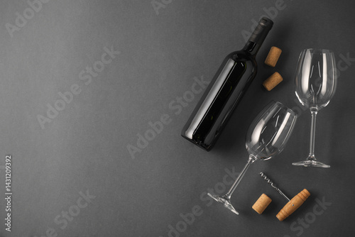 © New Africa, Naklejka premium Bottle of wine, corks and glasses on grey background, flat lay. Space for text