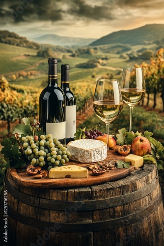 Fototapeta premium Bottle of wine, glass and grapes on a vineyard background