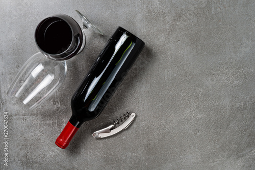 © Julio Ricco, Naklejka premium Bottle of wine glasses and opener on concrete background. Copy Space.