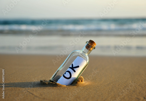 Obraz premium Bottle on the beach with an affirmative answer inside, ok