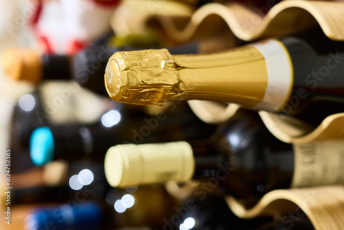 Obraz premium Bottle rack. Bottles of champagne and wine in a bottle rack.