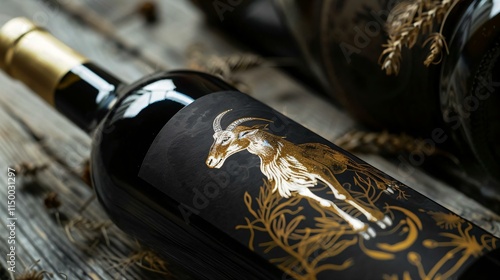 Naklejka premium Bottle wine goatthemed label sits wooden surface