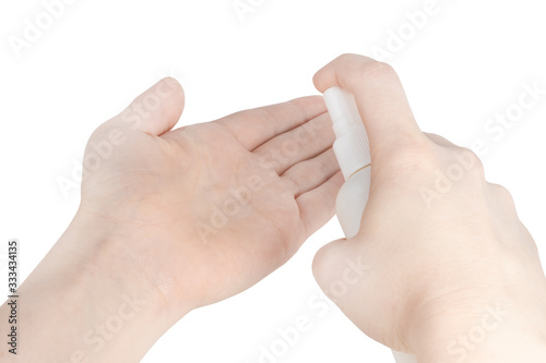 © Oleksandr, Naklejka premium bottle with antibacterial antiseptic spray in hand isolated on white background