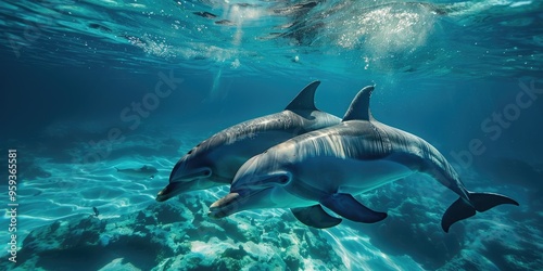 © AkuAku, Fototapeta premium Bottlenose Dolphin Mother and Calf Swimming in the Deep Blue