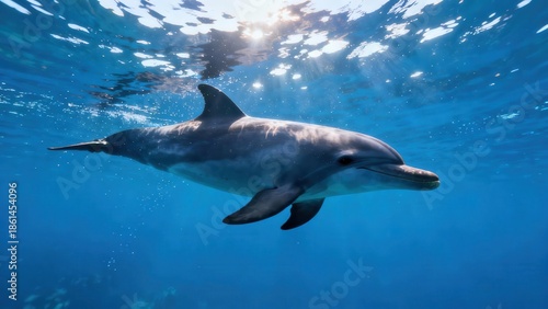 Fototapeta premium Bottlenose dolphin swimming gracefully through deep blue ocean water illuminated by bright sunlight filtering down from the rippling surface.