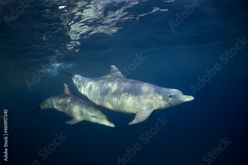 Naklejka premium Bottlenose dolphins in the group. Dolphins near the diver. Play with dolphins in Indian ocean. Marine life.