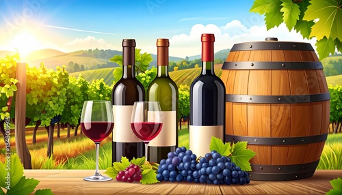 Fototapeta premium Bottles And Wineglasses With Grapes And Barrel In Rural Scene