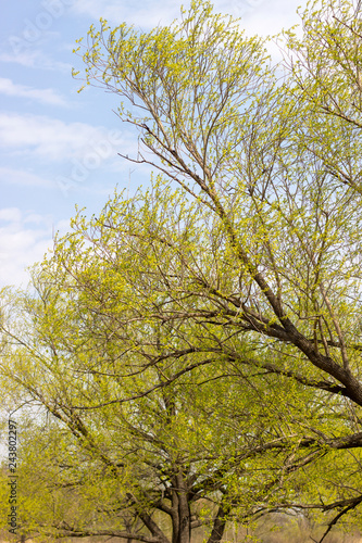 © Анна Волгина, Fototapeta premium Bottom view of a tall tree in a forest
