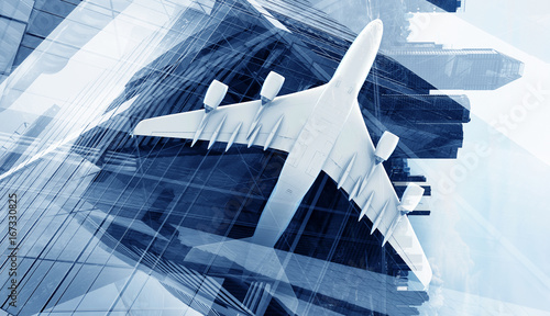 © Sergey Nivens, Obraz premium Bottom view of airplane above city. Mixed media