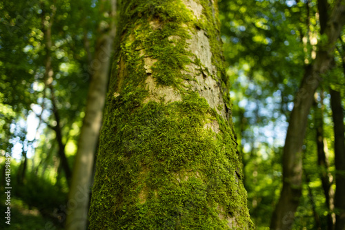 © Shi , Obraz premium Bottom view of forest trees. Nature green wood sunlight backgrounds.