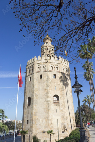 © Eliane, Fototapeta premium Bottom view of Golden tower or Torre del Oro, a medieval military control tower on riverside of Seville, Andalusia, Spain.