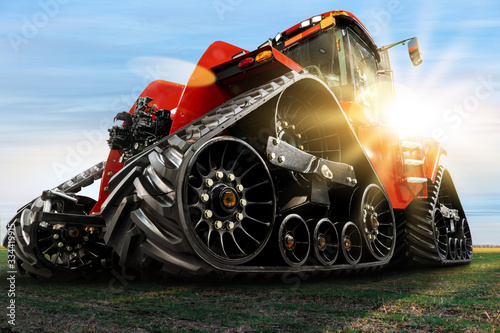 © scharfsinn86, Fototapeta premium Bottom view of rubber tracked agricultural tractor.