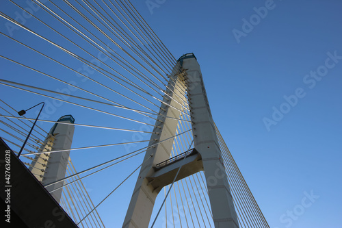 © Elena, Obraz premium Bottom view of the cable-stayed bridge supports and cable stays against the sky