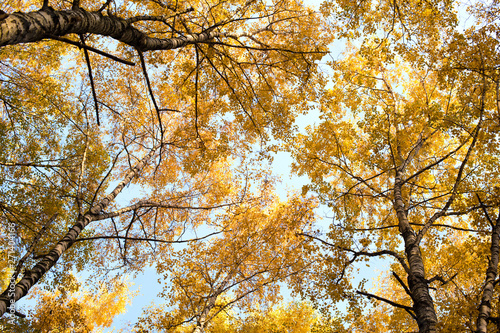 Fototapeta premium Bottom view on the tall birch trees in the golgen autumn forest under blue sky. Indian summer.