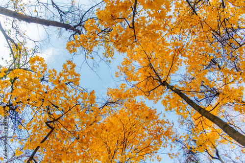 Fototapeta premium Bottom view to blue sky in autumn forest