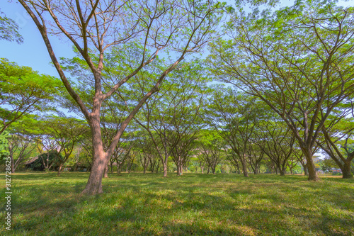 © Peerapong, Fototapeta premium Bottom view to the tree top of nature background