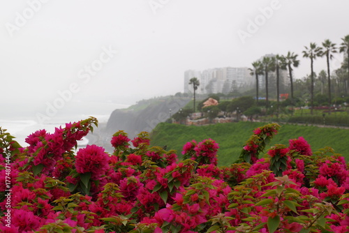 © Taisiia, Fototapeta premium Bougainvillea flowers against a backdrop of buildings on the Pacific Ocean in the Miraflores district of Lima.