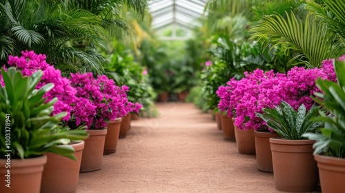 Fototapeta premium Bougainvillea Flowers in Pots Lining Garden Path Inside Greenhouse with Natural Light Ambience
