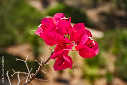 © varbenov, Obraz premium Bougainvillea glabra red blooming flower bush closeup