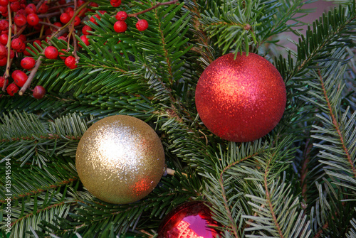 Fototapeta premium Boules de Noël or et rouge dans sapin vert