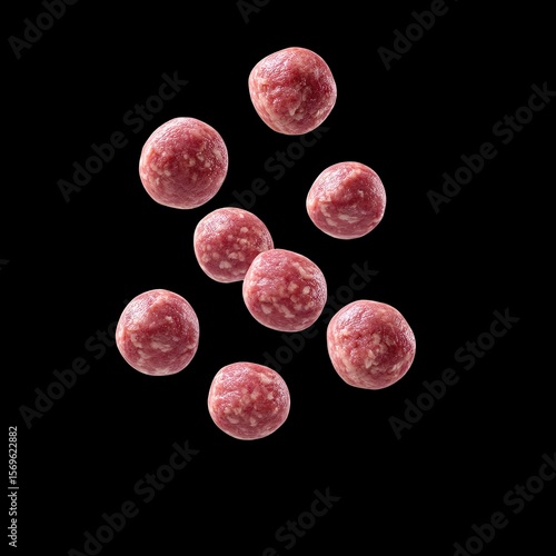 © Matcha_09, Obraz premium Bouncy meatballs with tender elastic texture, showcasing vibrant red color against black background, evoke sense of freshness and culinary delight