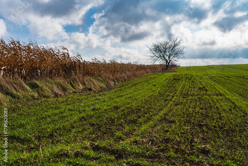Obraz premium boundary separating fields with winter grain and ripe corn