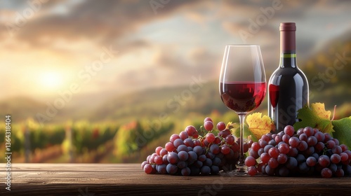 © tuiphotoengineer, Fototapeta premium Bountiful Autumn Harvest A Scenic Vineyard Landscape with Wine Bottles and Glasses This image captures the beauty and abundance of the autumn harvest season