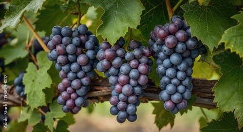© The 2R Artificiality, Fototapeta premium Bountiful ripe grapes clustered on thriving grapevine leaves