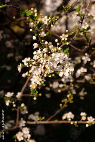 Fototapeta premium Bouqet Of White Plum Flowers On A Brunch. Sun Reflecting On Them