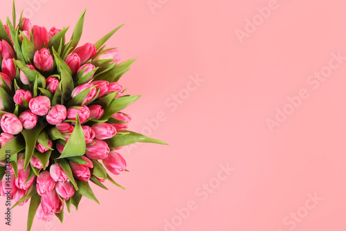 © New Africa, Naklejka premium Bouquet of beautiful tulips on pink background, top view. Space for text