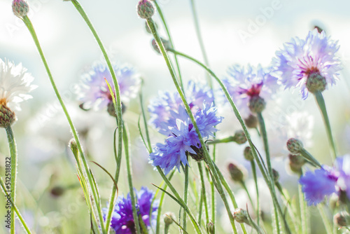 © Emils, Naklejka premium Bouquet of bright blue flowers. Blue flowers, summer field plants. Green blurred background. Beautiful flower. Background full of blue Cornflowers .Closeup Cornflowers. Cornflower texture