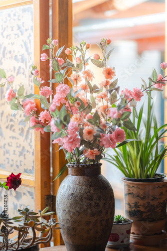 © padarn, Fototapeta premium Bouquet of dry roses in vintage vase near the window