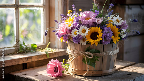 © irvan, Obraz premium bouquet of flowers in a wooden rustic