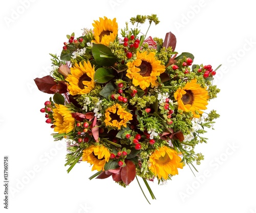 © Ruslan Gilmanshin, Obraz premium Bouquet of flowers top view on white background