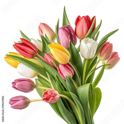 © SekhSadi, Obraz premium Bouquet of fresh multicolor tulips head isolated white background.AI GENERATED