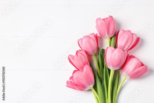 © New Africa, Fototapeta premium Bouquet of pink tulips on white wooden table, top view. Space for text