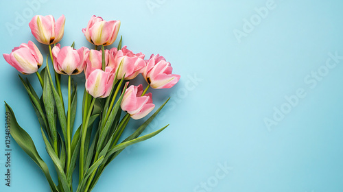 Fototapeta premium Bouquet of pink tulips with long green stems. Springtime celebrations.