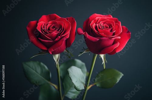 © Keopaserth, Fototapeta premium bouquet of two red roses with lush green leaves on dark background, symbolizing love and passion. vibrant petals create striking contrast, evoking deep emotions