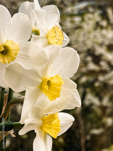 © Anastasiya Famina, Fototapeta premium Bouquet of white daffodils on the background of cherry blossoms in the garden. The first spring flowers