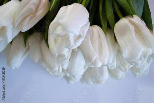 © TannySolt, Obraz premium Bouquet of White Tulips on Table