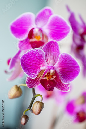 © mark_gusev, Obraz premium Bouquet with purple color flowers on a blurred light background. Calm and beautiful scene. Natural beauty. Selective focus.
