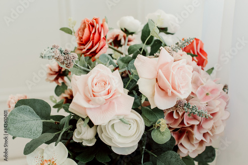 © Sarbinaz Mustafina, Obraz premium Bouquet with roses and green leaves on a white background