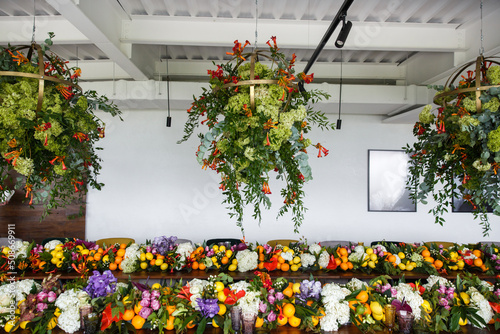 Naklejka premium Bouquets of flowers and fruits in vase on the wedding table