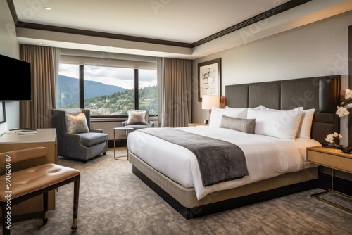 Fototapeta premium boutique hotel room with luxurious amenities, plush bedding, stylish furnishings, and panoramic views, offering a premium stay experience for discerning travelers - Generative AI