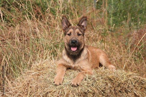 © Dogs, Naklejka premium bouvier des ardennes allongé dans la paille