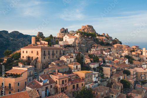 © Polonio Video, Obraz premium Bova Superiore al tramonto, vista aerea del borgo calabrese sulle montagne.